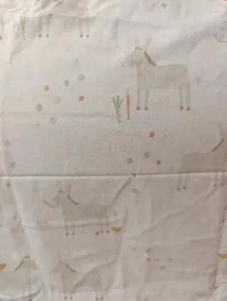 Juego de sábanas para cuna de Zara Home con un divertido estampado de burritos. Incluye la sábana encimera y la funda de almohada. Incluye también una sábana de bajera ajustable peso esta no es de Zara Home (pero es 100x100 algodón y con certificado Oekotex) Para cunas de 120x60 cm