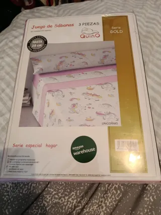Juego de sábanas de 3 piezas con un divertido diseño de unicornios. La funda de almohada y la sábana bajera tienen un estampado de unicornios, mientras que la sábana encimera presenta un borde rosa. - Incluye 3 piezas. - Altura especial para colchones de hasta 28 cm. - Serie Gold. - Composición: 50% Poliéster, 50% Algodón. - Lavar en programa moderado. - No superar los 40°. - Lavar colores fuertes por separado. - No limpiar en seco. - Planchado máximo 150°. Art 58