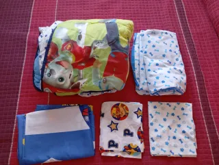 5 piezas. Un saco con bajera con cremallera, dos fundas de colcha y dos fundas de almohadas. - Diseño divertido con personajes. - Incluye saco y colchas. - Ideal para habitación infantil. Saco usado pero en buen estado. Las dos colchas nuevas, sin usar.