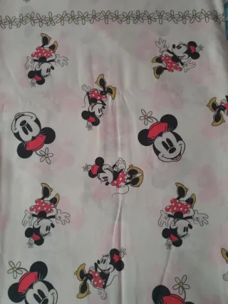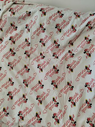 Conjunto de ropa de cama con estampado de Minnie Mouse. Sabana encimera y funda de almohada. - Diseño principal con Minnie y Mickey Mouse. - Estampado repetido de Minnie Mouse en la parte inferior. - Borde decorativo con motivos de Minnie y flores.