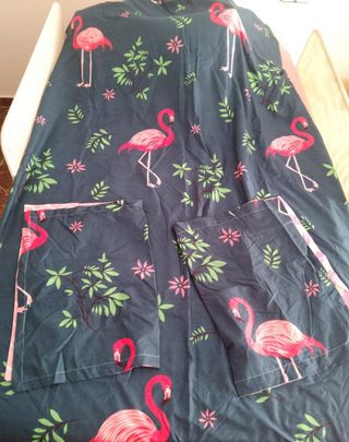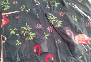 Conjunto de funda nórdica con un alegre estampado de flamencos rosas y hojas verdes sobre fondo azul marino. Ideal para camas de 80 o 90 cm..funda nordica 120x 200. Fundas almohadas 77x53. Sin estrenar, me confundi de medidas - Diseño con flamencos y flores. - Tejido suave y agradable.