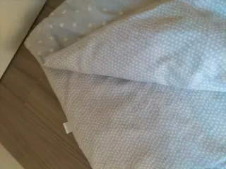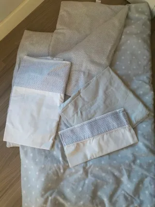 Conjunto de ropa de cuna con un bonito estampado gris clarito de estrellas o puntitos (reversible) - Incluye relleno nórdico+funda (reversible) - Almohada + funda - sábana + bajera - chichonera - marca micuna - Para cunas de 60*120