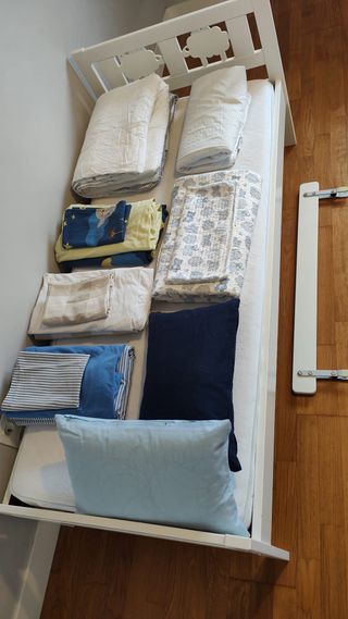 Cuna de Ikea Smagora con colchón de muelles ensacados Jattetrott también de Ikea. Se vende con 1 almohada con dos fundas protectoras, 2 fundas de colchón ajustables impermeables, 3 juegos nórdicos (funda+almohada), 3 bajeras y un juego de sábanas. También incluye protector de barrotes. Todo en muy buen estado con poco uso.