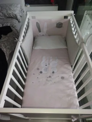 Cuna de madera en color blanco, ideal para el descanso del bebé. Incluye dos protectores acolchado con un simpático diseño de conejitos, almohada con funda, nórdico y sábana. - Estructura de madera blanca. - Protector acolchado con estampado de conejos y estrellas.