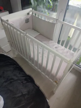 Minicuna de tijera con estructura de madera. - Diseño plegable. - Ruedas para facilitar el movimiento. - incluye protector de colchón de rizo, 2 sábanas bajeras, sabana encimera y funda de almohada aunq la almohada no se usó - tiene colchón de 4 cm que se ve en las fotos - en la parte de abajo del colchón tiene un enganchón como se ve en las fotos pero que una vez montada no se ve ni afecta a su uso