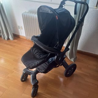 Carrito bebé Concord Neo de color negro compuesto por: grupo cero (maxicosi), capazo y silla de paseo. El capazo es blando y plegable. Incluye el colchón y sabana para cubrir el colchón. La silla de paseo tiene 3 posiciones y posibilidad de colocar la silla a favor de la marcha o en contra mirando hacia los papás. El manillar lleva funda porque el original se empezó a estropear. Incluye sombrilla, burbuja para la lluvia y el libro de montaje.