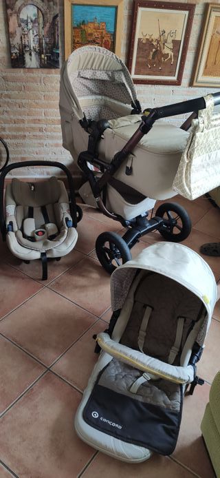Carro Concord Neo 3 piezas completisimo. Usado pero muy cuidado. Muy buenas condiciones. Color beisg con motivos. Compuesto por porta bebé grupo zero súper manejable, capazo ultraligero plegable modelo scout y silla de paseo. Chasis súper manejable deportivo con ruedas grandes “todoterrenos” y muy buena suspensión. Gran maniobrabilidad; dimensiones de plegado muy reducidas, fácil de transportar. La silla se puede poner en posición hacia delante o mirando hacia ti. El mejor carro del mundo. Como complementos lleva bolsa, cambiador, burbuja de agua hurricane, parasol de tela, sombrilla. Marca de desgaste en manillar mostrado en la foto donde se pone el soporte para el móvil. Lo incluyo de regalo. Opción de incluir fundas de invierno y capota a medida especial. ver otros anuncios o Consultarme para hacer lote. Se encuentra en Griñón y se puede venir a ver. Tengo mas fotos disponibles.