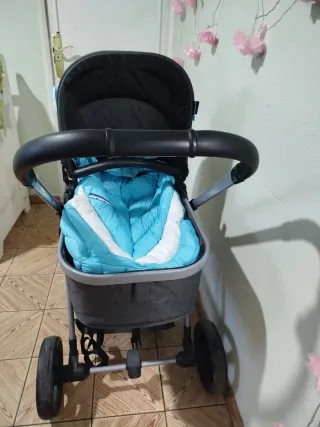 Cochecito antiguo, pero completo. Muy bien cuidado y con todas las fundas recién lavadas. TODOS LOS ACCESORIOS INCLUIDOS, menos la silla de auto grupo 0. - Uso: desde el nacimiento hasta aprox. 3-4 años (0-15 kg). - 3 x 1 : con solo 2 clics, añade un capazo de recién nacid@, una silla de auto grupo 0 o silla de paseo (asiento reversible). - Ruedas: todoterreno. - Plegado: se mantiene de pie. - Manillar: ajustable en altura. - Incluye: 3 protectores de lluvia + saco de bebé para capazo.