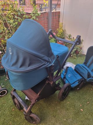 Conjunto de paseo para bebé de la marca Jane en color azul. Incluye silla de coche y capazo. - Silla de coche grupo 0+. - Capazo. - Silla de paseo. - Capota. - Cesta inferior. Tiene unos agarres rotos de la funda pero no afecta al funcionamiento ver fotos Regalo dos fundas para máximo.