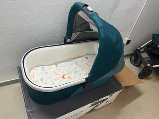 Carrito en buen estado, con capazo plegable, funda para lluvia, bolso y silla de auto Koos i-Size (maxicosi). Tanto el capazo como el maxicosi estan nuevos a estrenar porque coincidió con el confinamiento. Muy facil de conducir, no vibra y las ruedas estan en buen estado. Se pliega facilmente, las ruedas traseras son extraibles para facilitar el transporte y almacenamiento, asiento reversible y reclinable en 3 posturas. Manillar regulable en altura con 7 posiciones. Peso total de 12,9 kg Se vende porque hace tiempo que no lo usamos y no lo vamos a usar mas y porque nos ocupa espacio.