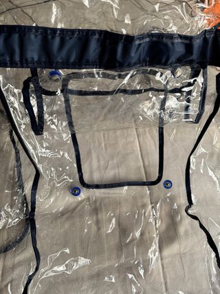 Protector de lluvia transparente para capazo de coche de bebé. Mantiene al bebé seco y protegido de la intemperie. - Burbuja de plástico transparente. - Ribete azul oscuro. - Ventana frontal con cierre de botones a presión.
