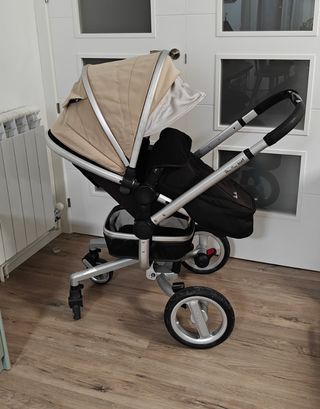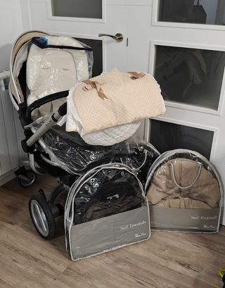 En muy buen estado y muy cuidado. Conjunto de muy buena calidad, resistente y seguro. La verdad que es maravilloso, cumplió nuestras expectativas con creces. Silla de paseo con toldo, regulable en la inclinación de respaldo y pies. Capazo amplio y cómodo con funda para piernas. Grupo 0 (silla del coche) muy segura y cómoda con soporte isofix y barra anti-rotación. Regalo guantes nuevos de pelo muy suaves y calentitos para el manillar, 2 sombrillas, funda de plástico para la lluvia y 4 ruedas de recambio nuevas (aunque las que tiene puestas están bien conservadas). Se pliega bien y de manera sencilla. Todo lavable. Todo costó 1.000€.