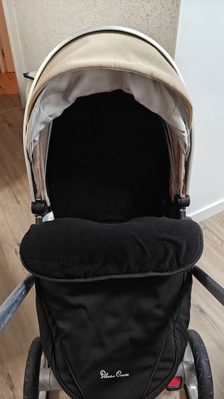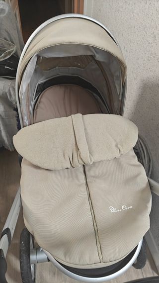 Se vende carro Silver Cross Surf. Consta de silla y de reductor almohadillado que hace de capazo. Tiene dos juegos de capota, saco y protector de silla ( lado invierno y lado verano) en color negro y marrón clarito. También tiene protector lluvia y una funda para el verano hecha a medida. Se regala bolso grande en color negro con los enganches para el carro. Lo único que está deteriorado es la goma negra del manillar. Las ruedas y demás están perfectas.