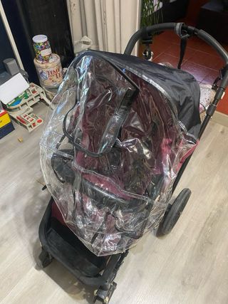 Cochecito de bebé trio en color morado. Está en buen estado y listo para usar. Algúna mancha del uso y de estar guardado - Incluye capazo. - Arnés de seguridad. - Tejido suave y acolchado. - Plástico para la lluvia, - Fundas