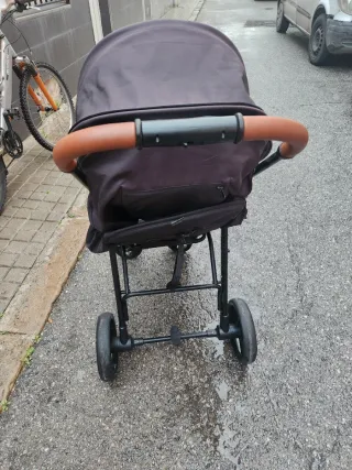 Carro de bebé con capazo y manillar. - Capazo de color oscuro. - Manillar con funda de polipiel marrón. - Ruedas negras.