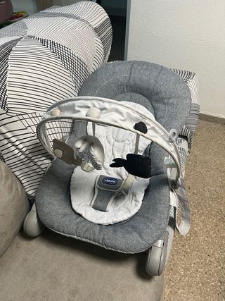 Hamaca para bebé de la marca Chicco en color gris. Cuenta con un reductor para recién nacidos y un arnés de seguridad. Necesita lavar, del resto está perfecto. Tiene vibración. Le falta el musical. La funda es de poliéster, se puede desmontar para lavar en lavadora. - Diseño acolchado. - Incluye un divertido estampado. - Marca: Chicco.