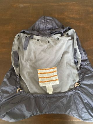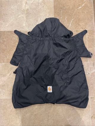 Funda impermeable para mochila portabebés Ergobaby. Protege al bebé de la lluvia y el viento. - Color negro, interior polar gris. - Diseño con capucha. - Cierre de botones.