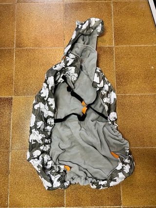 Funda para porteo con un divertido estampado de osos polares. Es impermeable y tiene forro polar para mantener abrigado al bebé. - Estampado de osos polares. - Tejido exterior impermeable. - Forro interior de polar. - Bolsa para guardarlo Solo se usó dos meses.