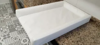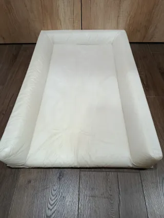 Cambiador de IKEA con funda INCLUIDA -El cambiador está relleno de espuma y forrado en plástico adecuado y cuidadoso con la piel del bebé. -Está acolchado,es blandido,cómodo,suave e impermeable. -Su superficie se limpia muy fácil solo con un trapo o bayeta húmeda y jabón neutro.Se seca rápido. -Tiene 3 bordes elevados para evitar que el bebé se caiga.El bebé estará muy seguro tumbado sobre el. -La funda que incluye está NUEVA,es blanca,lisa y de tela suave.Se puede quitar con facilidad del cambiador y lavarla en la lavadora o a mano. -El cambiador no tiene nada roto. -La funda de tela está perfecta. Ancho:74cm Fondo:48cm Alto:7cm