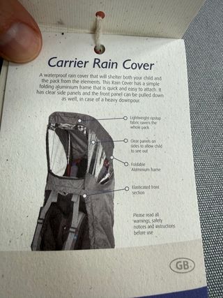 Funda impermeable diseñada para proteger la mochila portabebés. - Material impermeable. - Color negro. Se pone encima de la mochila y protege al bebé de la lluvia, con capucha.