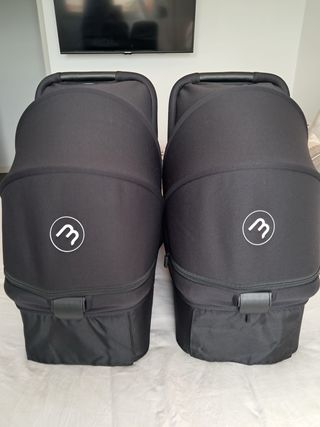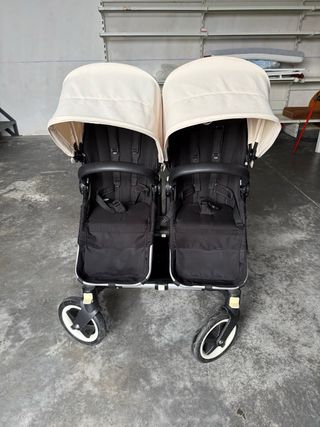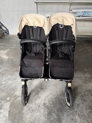 Carro gemelar Bugaboo Donkey3 Duo en color negro y beige. - Chasis de aluminio. - Dos asientos reversibles. - Capotas extensibles. - Cesta lateral de gran capacidad. - capazo con capota - fundas impermeables lluvia