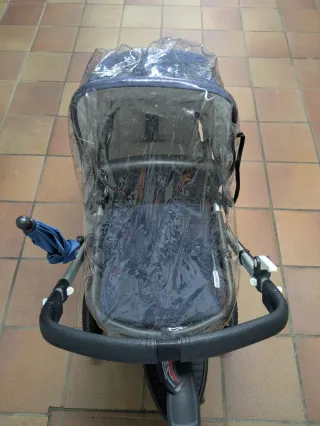 Carrito de bebé con funda protectora. - Funda impermeable de plástico transparente. - Asa acolchada negra. - Ruedas negras.