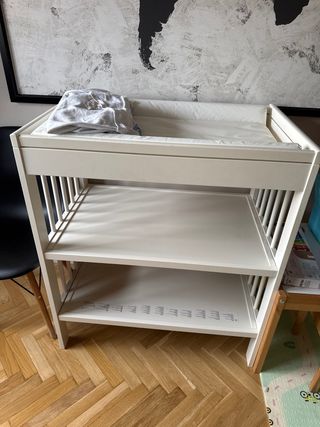 Cambiador de Ikea en buen estado, ideal para la habitación del bebé. Incluye colchoneta y tres fundas. - Colchoneta impermeable. - Tres fundas de tela para la colchoneta.