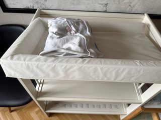 Cambiador de bebé de la marca Ikea en color blanco. Cuenta con dos estantes inferiores para almacenamiento. - Estructura de madera. - Colchoneta impermeable incluida. - 2 fundas como nuevas. La estructura de madera tiene un corte en la parte trasera, como se puede ver en las fotos. Por lo demas esta como nuevo.