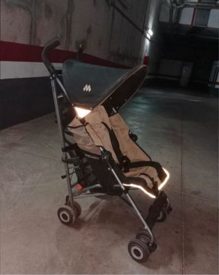 Carro de bebé de la marca Maclaren. - Color beige y negro. - Incluye arnés de seguridad. - Capota con ventana.