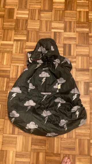 Funda para portear a tu bebé, con un divertido estampado de nubes y rayos. - Diseño en color negro con detalles plateados. - Marca: Bundlebean - Es muy amplio, cálido y fácil de ajustar. - Posiciones: porteo delante y detrás. - Con capucha desmontable y gran bolsillo exterior para mantener las manos calientes del porteador o de los peques cuando si lo estamos usando en la silla de paseo. - Doble tejido, forro polar con tela impermeable.