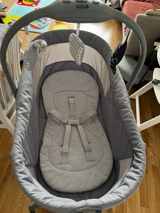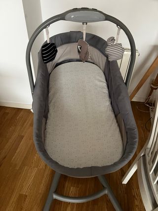 Mini cuna versátil Chicco Baby Hug. - Diseño moderno en color gris. - Incluye capota con juguetes. - Colchón con estampado de ositos. Plus 5 sabanas y 3 Fundas impermeables (precio 81€) - Casi nuevos! Muy poco usados.