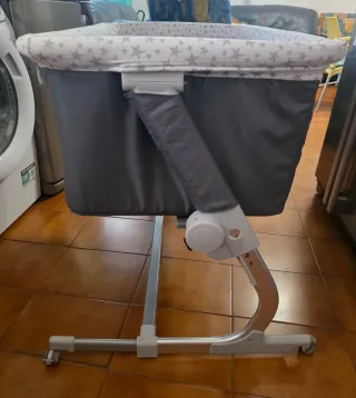 Preciosa y ligera minicuna colecho de Jané, totalmente desenfundable para facilitar el lavado, completamente vestida, con colchón ,dos sábanas ajustables impermeables ,una sábana ajustable normal y edredón con funda, rejilla transpirable y abatible, seis posiciones independientes en ambos lados para regularla en altura o inclinación, ruedas giratorias y con freno, para bebés de peso hasta diez kilos, pequeño cosido perfecto de un agujerito que apenas se aprecia.
