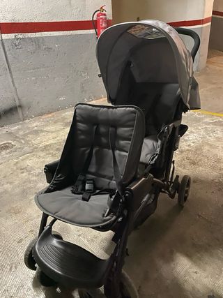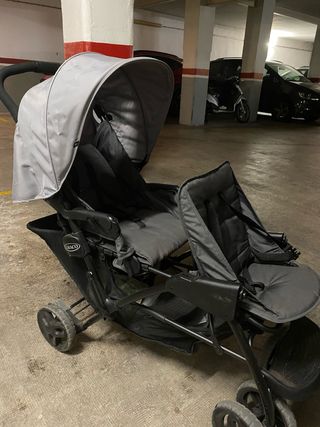 Cochecito gemelar de la marca Graco, ideal para dos niños. - Diseño en color gris. - Capota para ambos asientos. - Ruedas delanteras giratorias.
