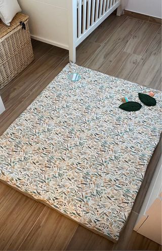 Colchoneta IMPERMEABLE por ambos lados y DESENFUNDABLE para bebé con estampado floral y de hojas. Es enrollable, lo que facilita su transporte y almacenamiento. Relleno de colchón de espuma firme y estable, de 2 cm de grosor. Funda interior anti-ácaros y repelente al agua. Medidas: 110×140 cm - Incluye un pequeño espejo. - Dos hojas de tela para jugar, que hacen sonido. Precio original: 150€