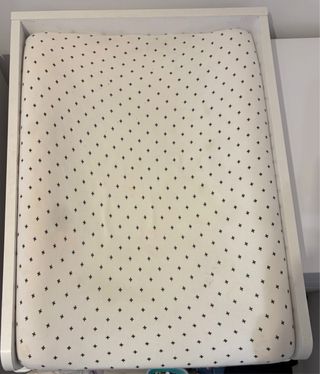 Cambiador de bebé de madera para poner sobre comoda. Incluye colchon con plastico impermeable y dos fundas como la que se ve en la foto. Se adapta a la mayoría de las cómodas estándar. Las medidas son 74x54x8-10 cm de alto. La estructura de madera esta nueva. Las fundas del colchon usadas pero se pueden comprar a parte nuevas medidas estandard. - Diseño unisex. - Material suave y fácil de limpiar