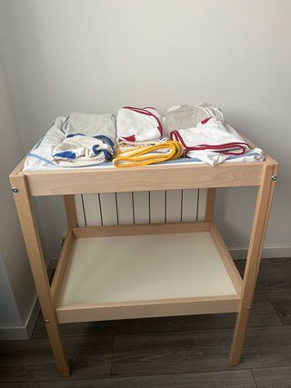 Se vende cambiador de bebé de Ikea, ideal para la habitación infantil. Adaptado para el cojín de gomaespuma y no para el inflable que trae para éste cambiador. Precios nuevo: - Cambiador de madera Sniglar = 39,99 €. - Cojín Vädra impermeable = 19,99 €. - Dos fundas de tela para el cojín Vädra como nuevas usadas siempre con protector = 19,98 €. Todo = 79,96 €.