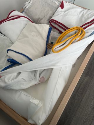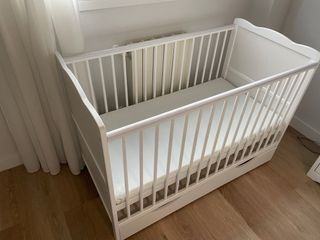 Se vende cuna con cajón inferior con tapa, barreras desmontables, colchón de espuma de aloe vera, convertible en cama infantil. A ESTRENAR. En estado IMPECABLE. Cuenta con protecciones en las barreras para los dientes y 3 posiciones de altura para el somier. NUNCA SE HA USADO. El bebé siempre durmió en nuestra cama. Se incluye edredón, almohada, dos protectores de colchón impermeables, funda de almohada, tres sábanas bajeras y dos juegos de funda nórdica completos. TODO A ESTRENAR. Las patas tienen unas muy ligeras marcas es una cara debido a meter y sacar el cajón (ver fotos). Dimensiones: 125x65 cm. Se entrega desmontada.