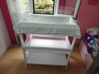 Cambiador de bebé de la marca Ikea, en color blanco. Ideal para la habitación infantil. Medidas: alto 92cm, largo 76cm, ancho 52cm - Con dos ruedas para desplazarlo con facilidad - Estructura de madera. - Dos baldas inferiores para almacenamiento. - Colchoneta impermeable incluida. - Funda a medida con alguna mancha -Manta de estrellas para cubrir - Posibilidad de regalar el organizador de pañales en color rosa y gris - Tiene la madera marcada de un producto pero no dificulta su uso ni se ve porque el colchón va encima