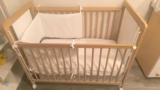 Cuna de madera (haya, hecha en Alemania) para bebé, incluye colchón con funda lavable como nueva y sábana bajera nueva que nunca hemos usado. Es una cuna adaptable que puede servir de 0 a 3 años. Las ruedas se bloquean y desbloquean fácilmente, y permiten de mover la cama sin esfuerzo. La cuna es ligera y se monta en 15 minutos. Está ya desmontado y lista para su siguiente bebé :) 142x90x80 - Material: Madera. - colchón para bebé con funda lavable a 60, 140x70. - sabana bajera para bebé aislante y impermeable de algodón ecológico. - 2 posiciones de colchón (media y baja. - 3 palos amovibles en la barrera de un lado.