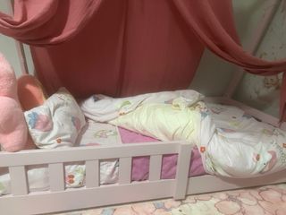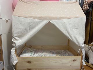 Cama infantil ideal para habitaciones de niños. Incluye colchón, sabana-funda de almohada, relleno nórdico, juego de dosel rosa decoración de cama, almohada de arcoíris-flor, protector impermeable. La alfombra de conejitos y luces en forma de estrellas gratis! - Medidas de la cama: 148cm. - Medidas del colchón: 70x140cm. Todo fue comprado hace 4 meses.
