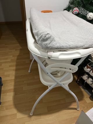 Bañera y cambiador para bebés, ideal para el cuidado diario. - Estructura plegable blanca. - Colchoneta - Bandeja inferior para almacenamiento. -Funda para la colchoneta. - bañera bajo la colchoneta, ergonomica para el bebe. Esta usada pero se le puede sacar bastante mas uso.