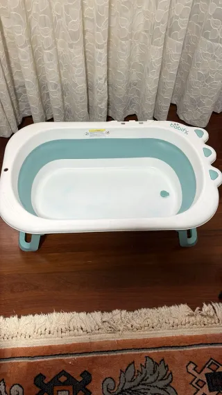 Bañera cambiador de plástico blanco para bebés. Cuenta con un asiento antideslizante para mayor seguridad. - Diseño ergonómico. - Superficie de apoyo para el bebé. - Compartimentos laterales para jabón y otros accesorios. Se ve en la foto los desperfectos: -Pequeña raja en el cambiador que siempre lo usamos con funda. Se regala la verde de la foto. -Las patas están oxidadas del agua. Pero funcionan y ruedan perfectas. -Se ha descolgado el hierro que va en el cambiador para fijarlo a la bañera. Pero lo tengo y se entrega también.