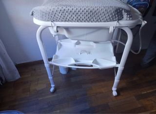 Práctica bañera cambiador para bebés de la marca Chicco. - Estructura de metal. - Altura regulable y ruedas con freno para moverla con facilidad. - Bandeja inferior para accesorios. - Plegable para que ocupe menos. Tiene un desperfecto en el plástico del cambiador que puede verse en la última foto, por lo demás esta fenomenal. Se puede poner una funda o usar así, no afecta a su funcionalidad.