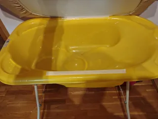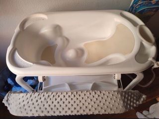 Práctica bañera para bebés con cambiador incorporado, ideal para el cuidado diario. - Estructura de soporte. - Cambiador acolchado. - Diseño funcional. Tiene los filos del cambiador un poco desgastado por fuera ( con una funda se ve más bonito) donde se acuesta el bebé está perfecto.