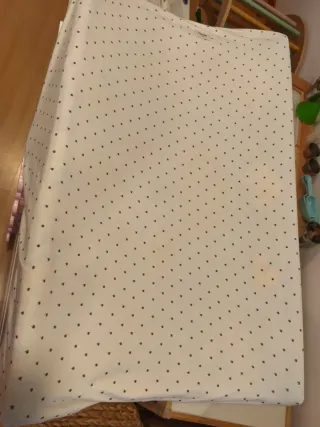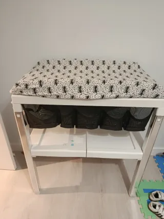 Cambiador jane para bebé con estructura metálica y bandeja inferior y bañera. - Colchoneta acolchada con estampado de estrellas. - Bandeja con dos compartimentos. - Patas con protectores. - colchon con dos grietas en la funda no afecta a su uso y se tapa con la funda. - varias fundas de regalo.