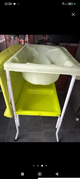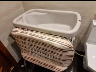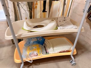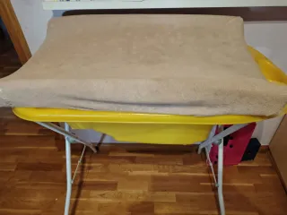 Cambiador con bañera incorporada para bebés. Ideal para el cuidado diario del pequeño. - Estructura plegable. - Bandeja para jabón y accesorios. - Ruedas para facilitar el transporte. La colchoneta está un poquito estropeada, pero con una funda no se aprecia y se usa perfectamente y no se nota ningún desperfecto. funciona bien.