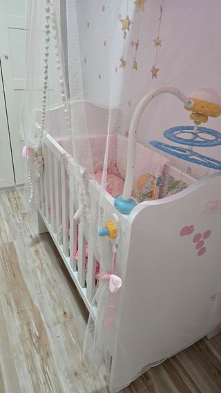 Cuna se bebé en perfecto estado, muy cuidada, se vende con todos los accesorios. Colchón Mosquitera Almacenamiento pañales Sabanas tanto para cuna como colchón y fundas impermeables. No tiene ningún desperfecto Es un chollazo, te gastarías más de 1000 euros comprándola nueva + colchón + accesorios.