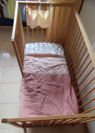 Cuna de madera, barra sube y baja ,distintas alturas, colchón antiahogo , chichonera sábanas y funda nórdica con relleno REGALO MANTAS Y SÁBANAS Y SACO