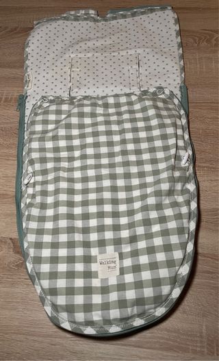 Saco para capazo de la marca Walking Mum con un bonito estampado vichy en tonos verdes. Es perfecto para mantener al bebé abrigado y cómodo. - Diseño vichy verde. - Etiqueta de la marca Walking Mum. - Regalo sábana blanca de colchon para capazo/cuco Está como nuevo, usado muy poquito tiempo. Es de entretiempo lleva relleno tipo edredón que se puede poner o quitar según clima. Regalo una funda de colchón para el capazo del carrito en color blanco.