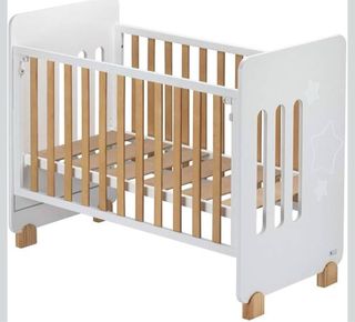 Cuna de bebé de la marca Interbaby, con un diseño moderno y funcional. - Estructura principal en color blanco. - Laterales con barrotes de madera. - Detalles decorativos de estrellas. - Base para colchón de listones de madera. - Incluye colchon, protector, sabana bajera y funda nordica(sin relleno) Si desea, puedo incluir las correas para el kit colecho y la extención del colchón, pero la maderita que venía en el kit se rompio. La estructura de la cuna tiene algunos daños, como se ve en las fotos, pero es funcional.